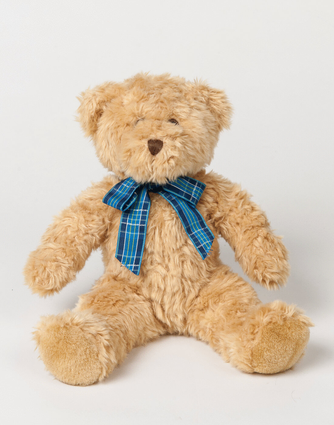 - Light brown bear with tartan ribbon
